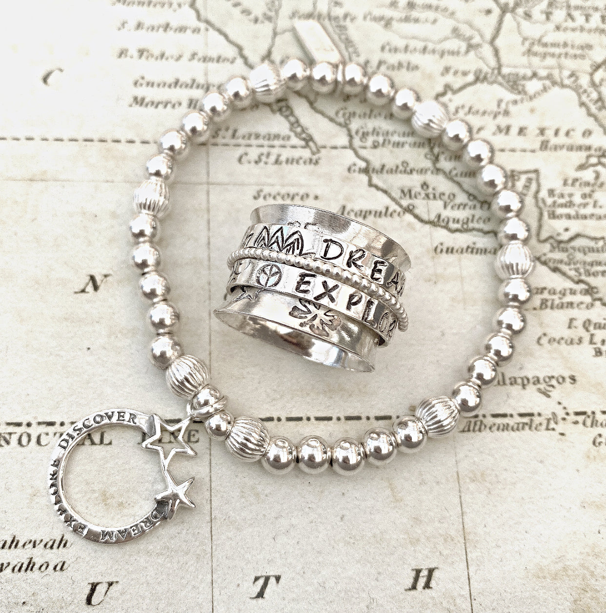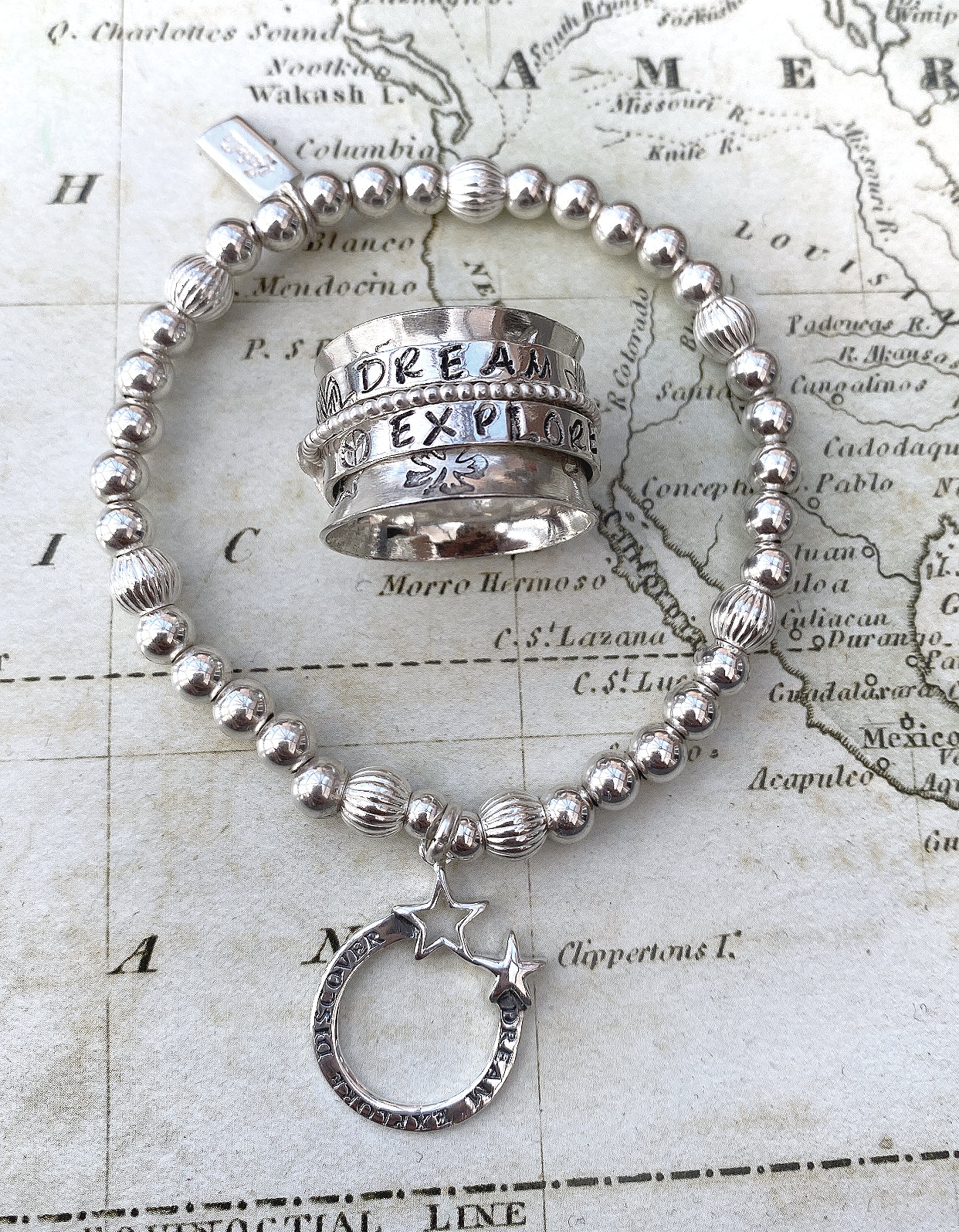 This stunning spinner ring is 15mm wife with 3 rings. The main ring is stamped with hibiscus flowers and stars. The spinning rings are stamped with Dream, Explore and the beaded ring features a plane!