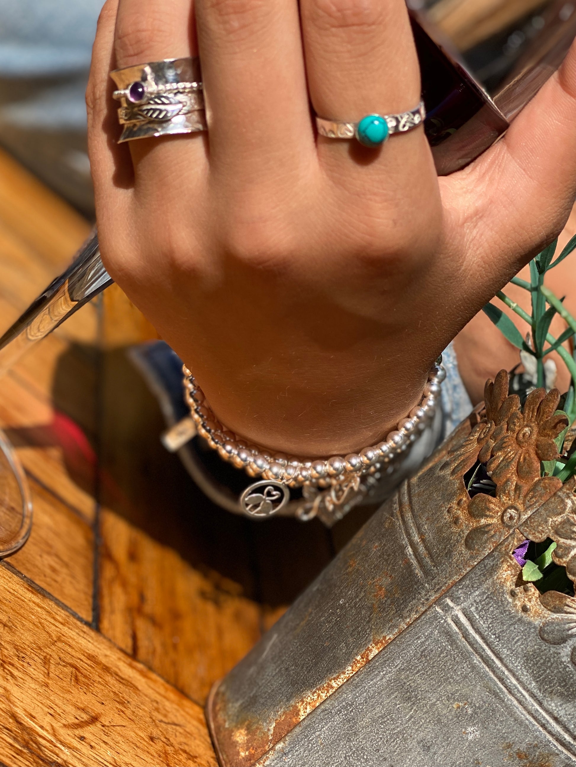 Handcrafted sterling silver band made to your size with a 6mm turquoise gemstone.