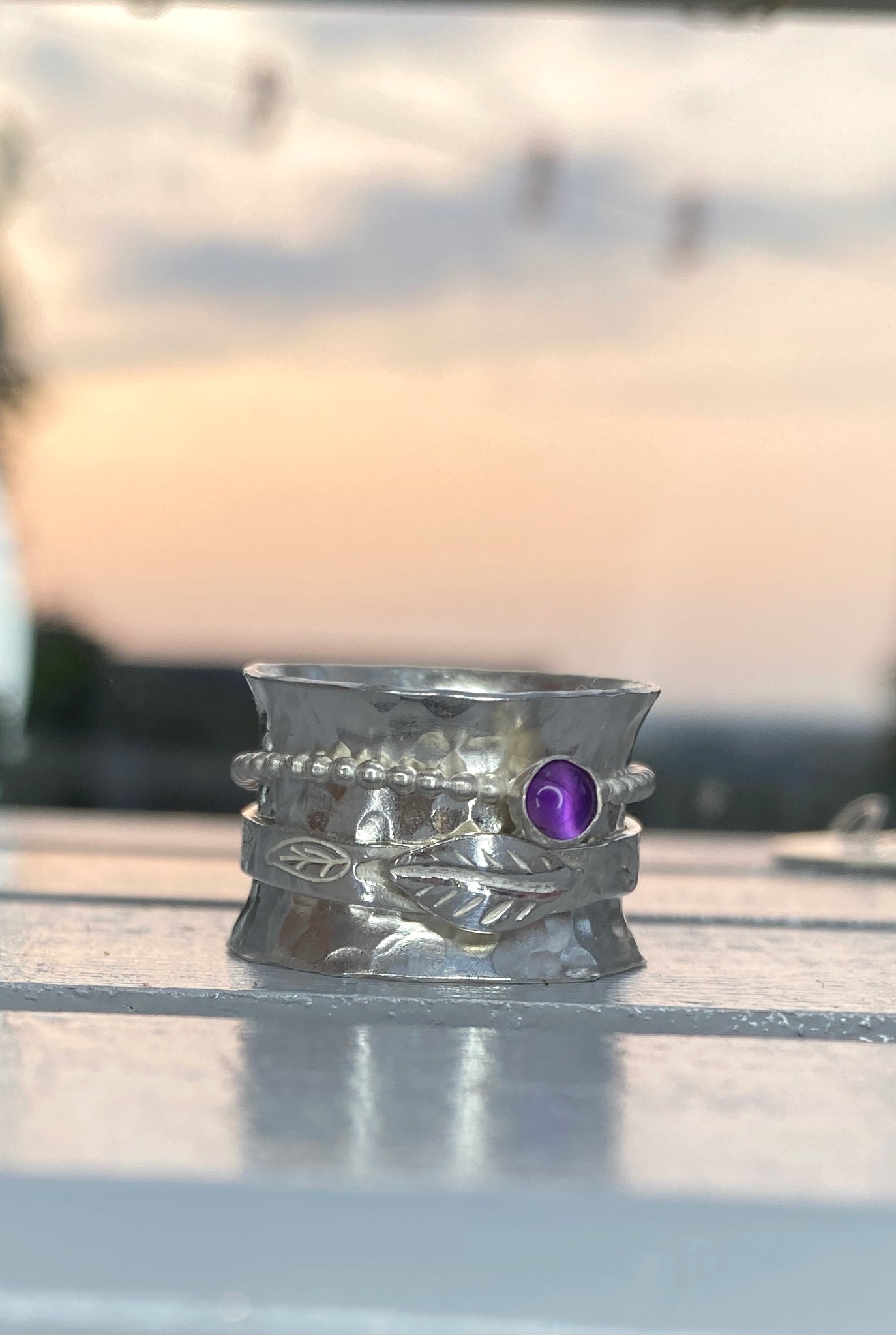 Handcrafted sterling silver spinner ring. The ring is 15mm wide and the band is hammered with 2 additional rings. A beaded band with a 4mm amethyst stone and a leaf band with leaves stamped around.