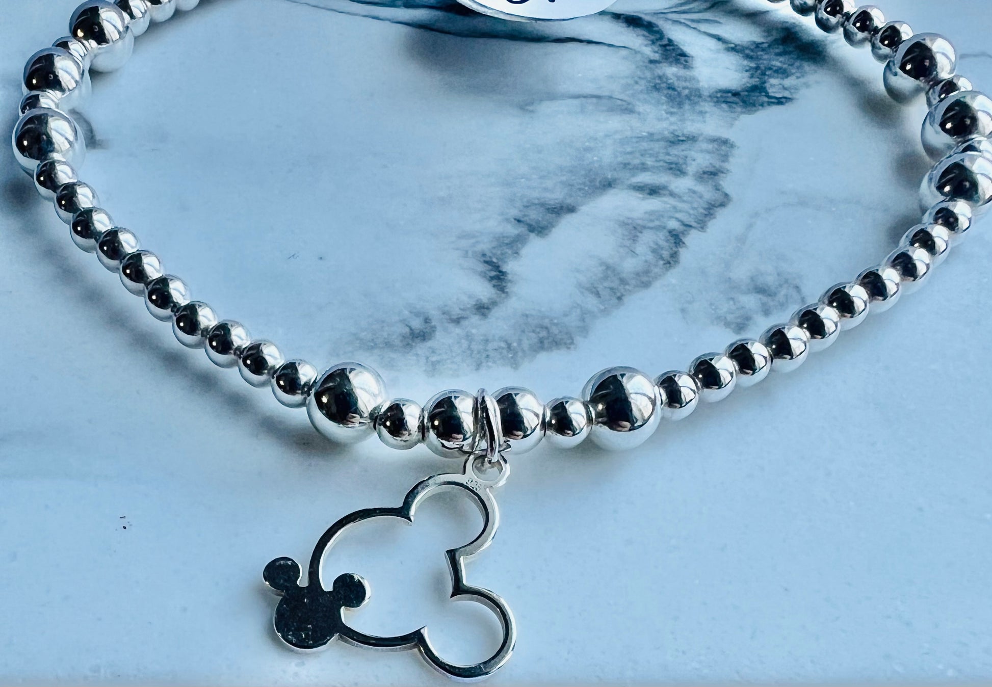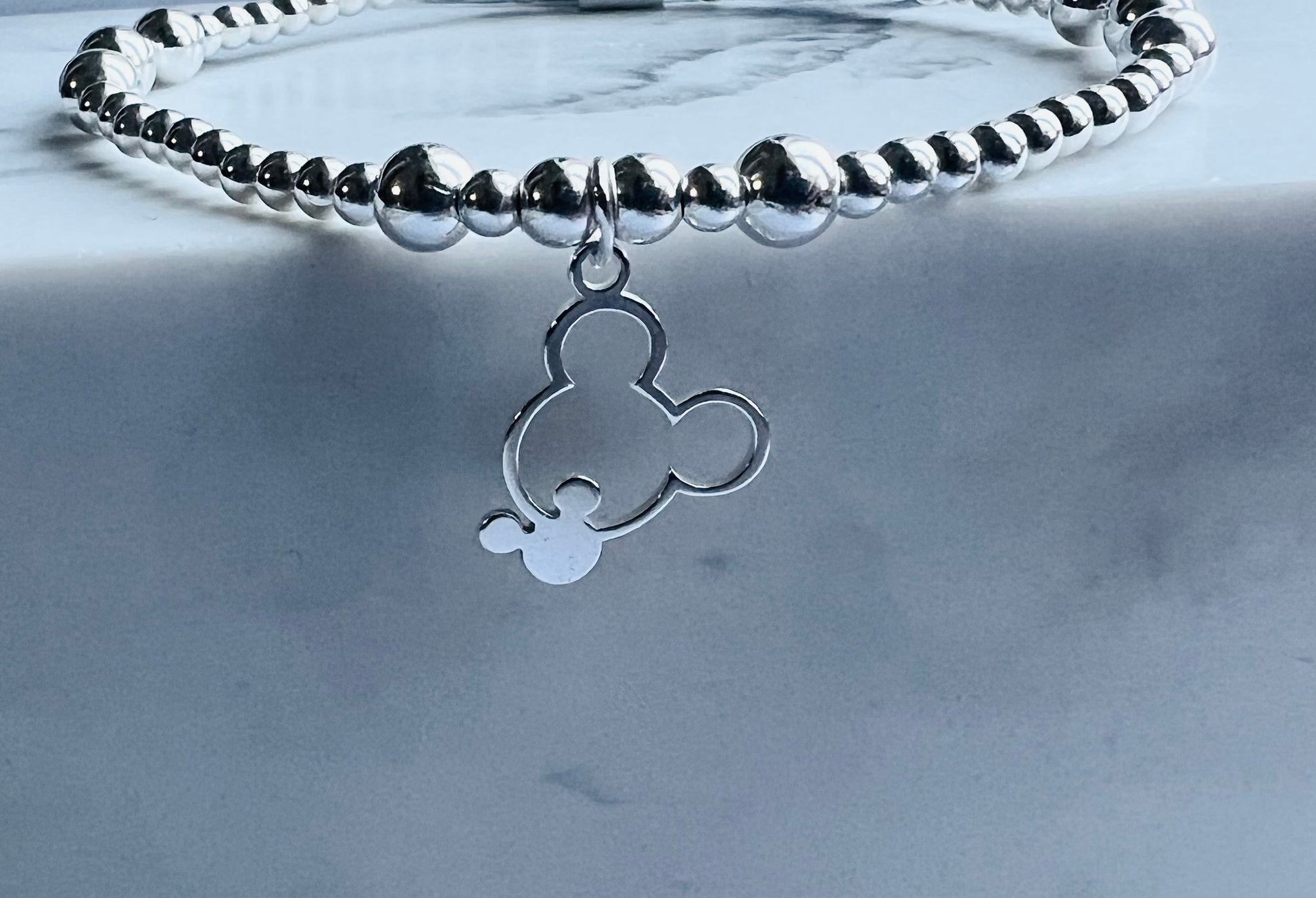 Sterling Silver Bracelet with 3mm and 5mm plain beads threaded onto very strong jewellers elastic with a Mickey Mouse charm.
