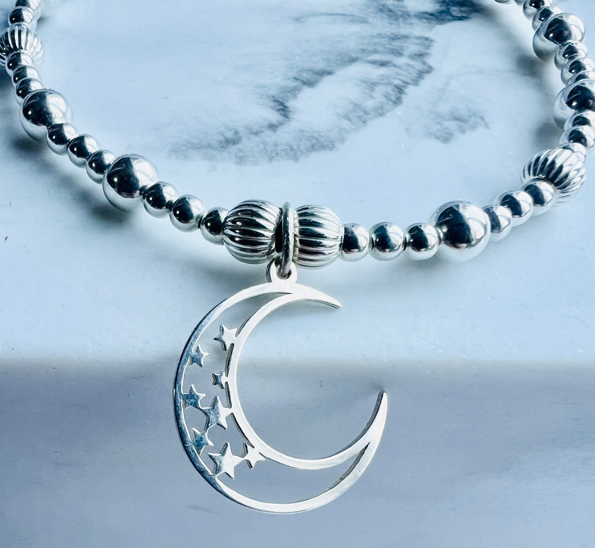 Sterling Silver Bracelet with 3mm and 5mm plain beads threaded onto very strong jewellers elastic with a Mickey Mouse charm.