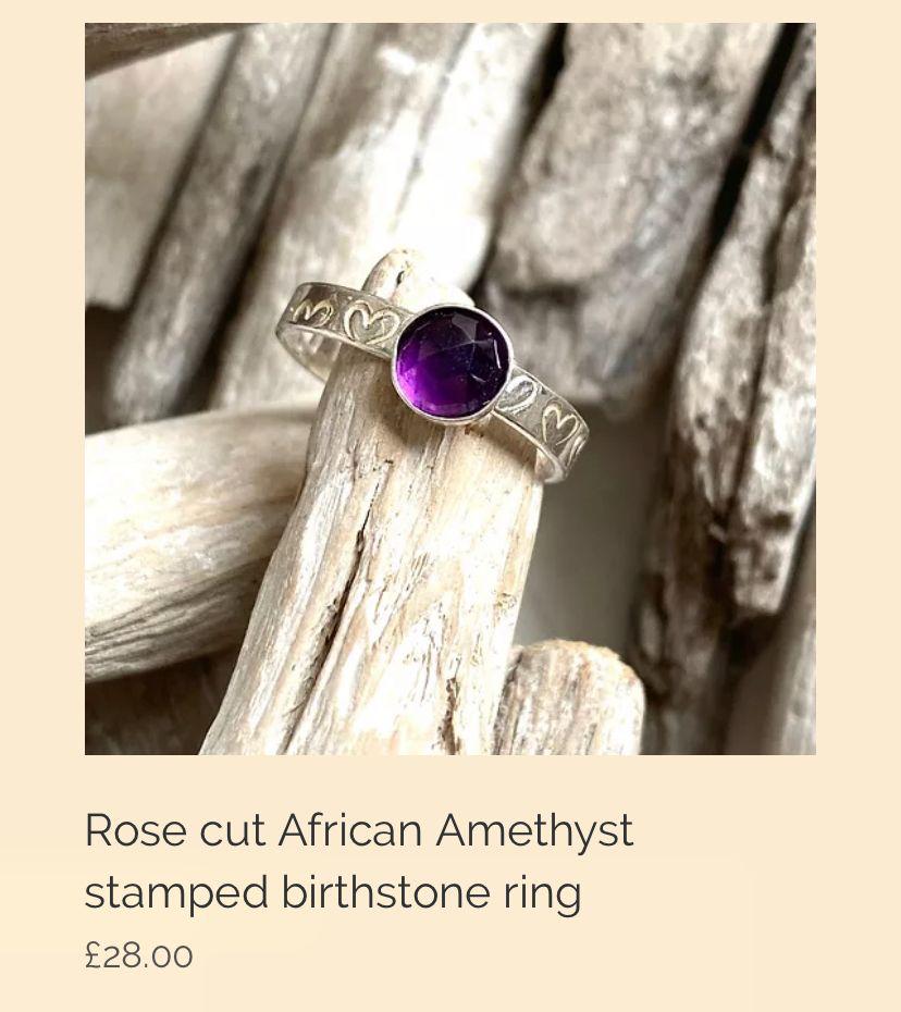 4mm wide sterling silver hand stamped ring with a 6mm rose cut African amethyst gemstone. This is a beautiful stone that sparkles due to the cut and is the most amazing bright purple colour. These are made to order so please add your size in the comments. A ring sizer be sent to you for the cost of a large first class stamp - please add a ring sizer (available within the rings section) to your basket when placing your order x