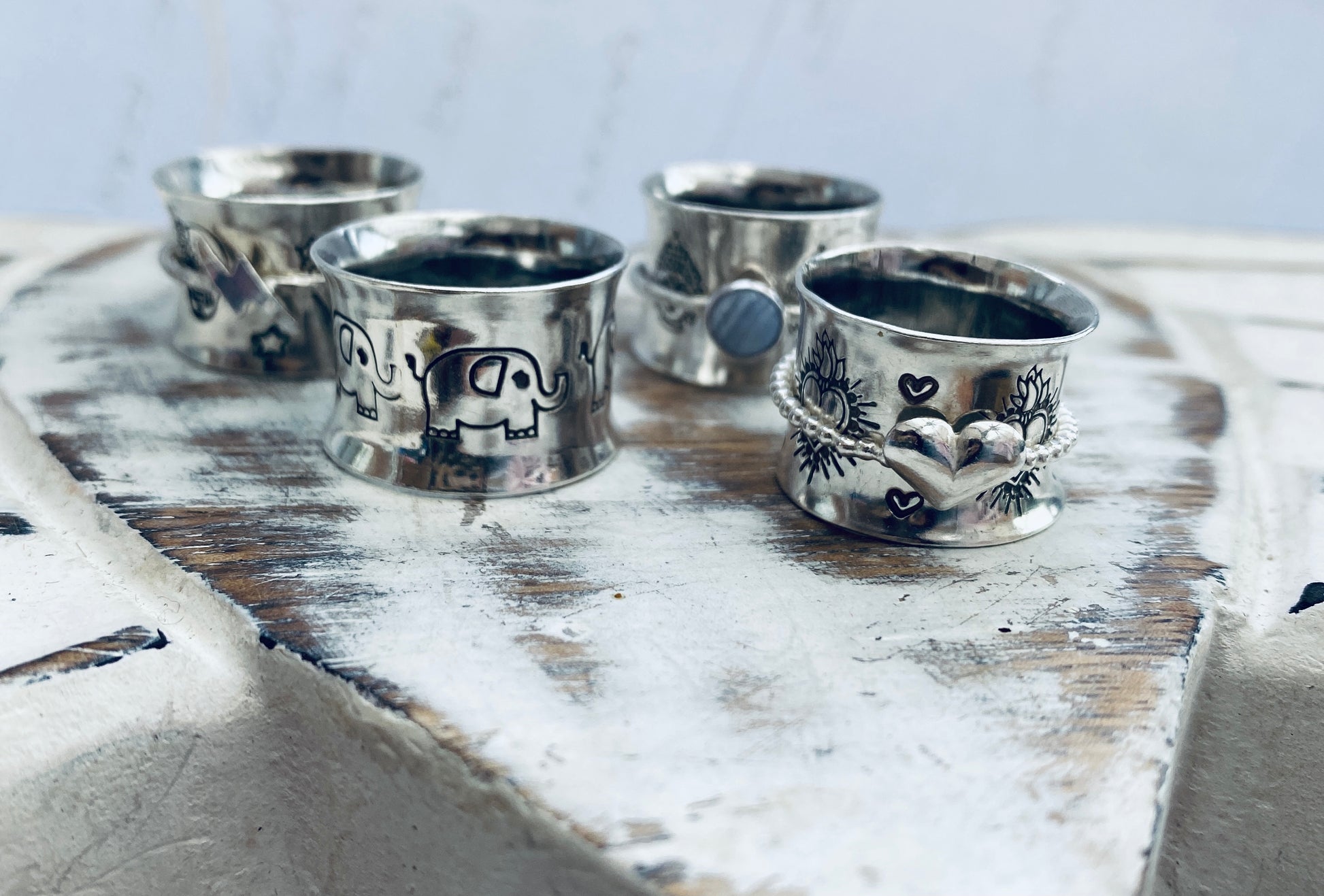 Sterling Silver handcrafted hand stamped sacred heart spinner ring. The ring is 15mm wide and 0.7mm thick with a puff heart beaded spinner ring.