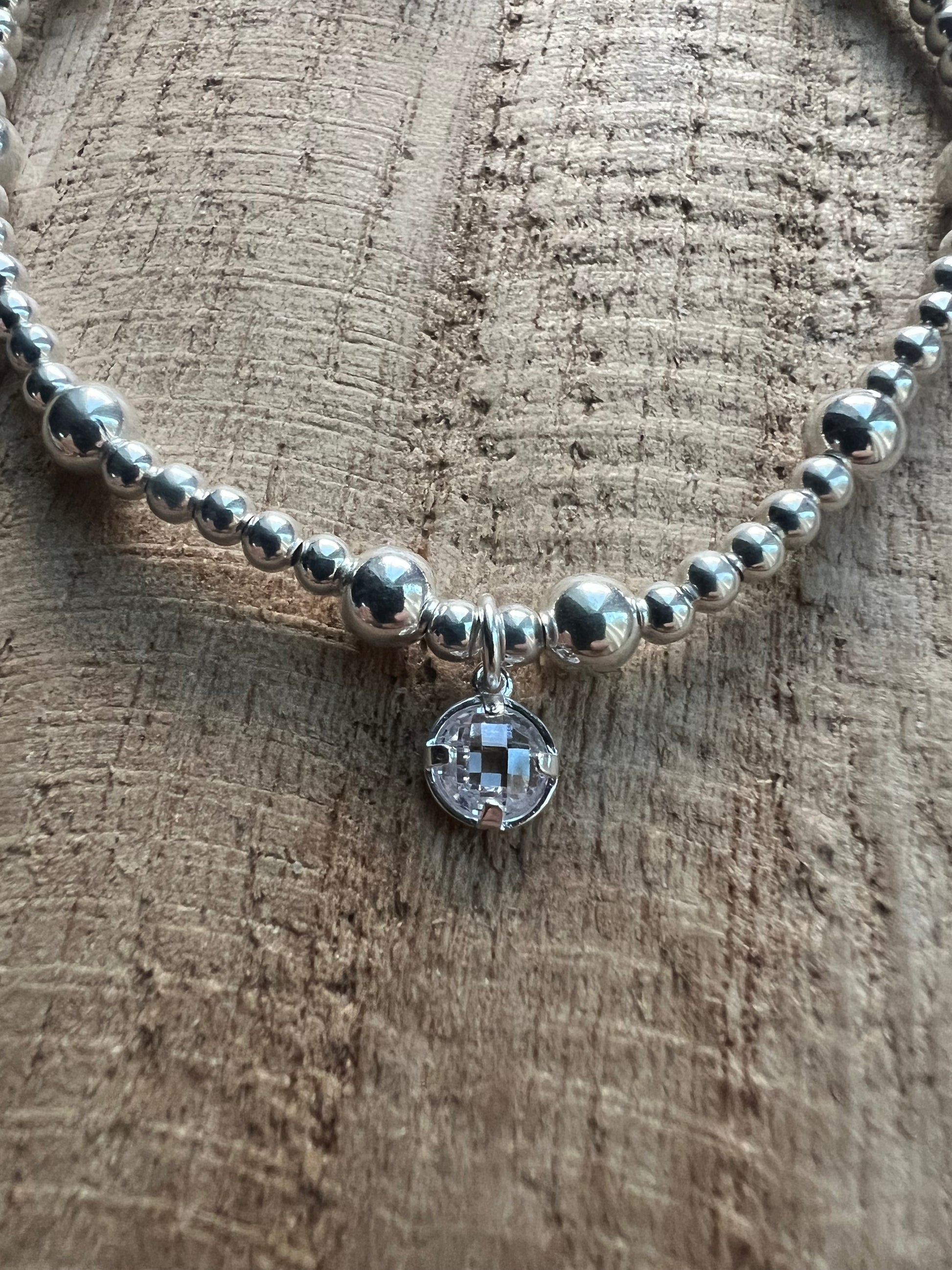Sterling Silver Bracelet with 3mm and 5mm plain beads threaded onto very strong jewellers elastic with a stunning small cz charm with a smiley face on the back.
