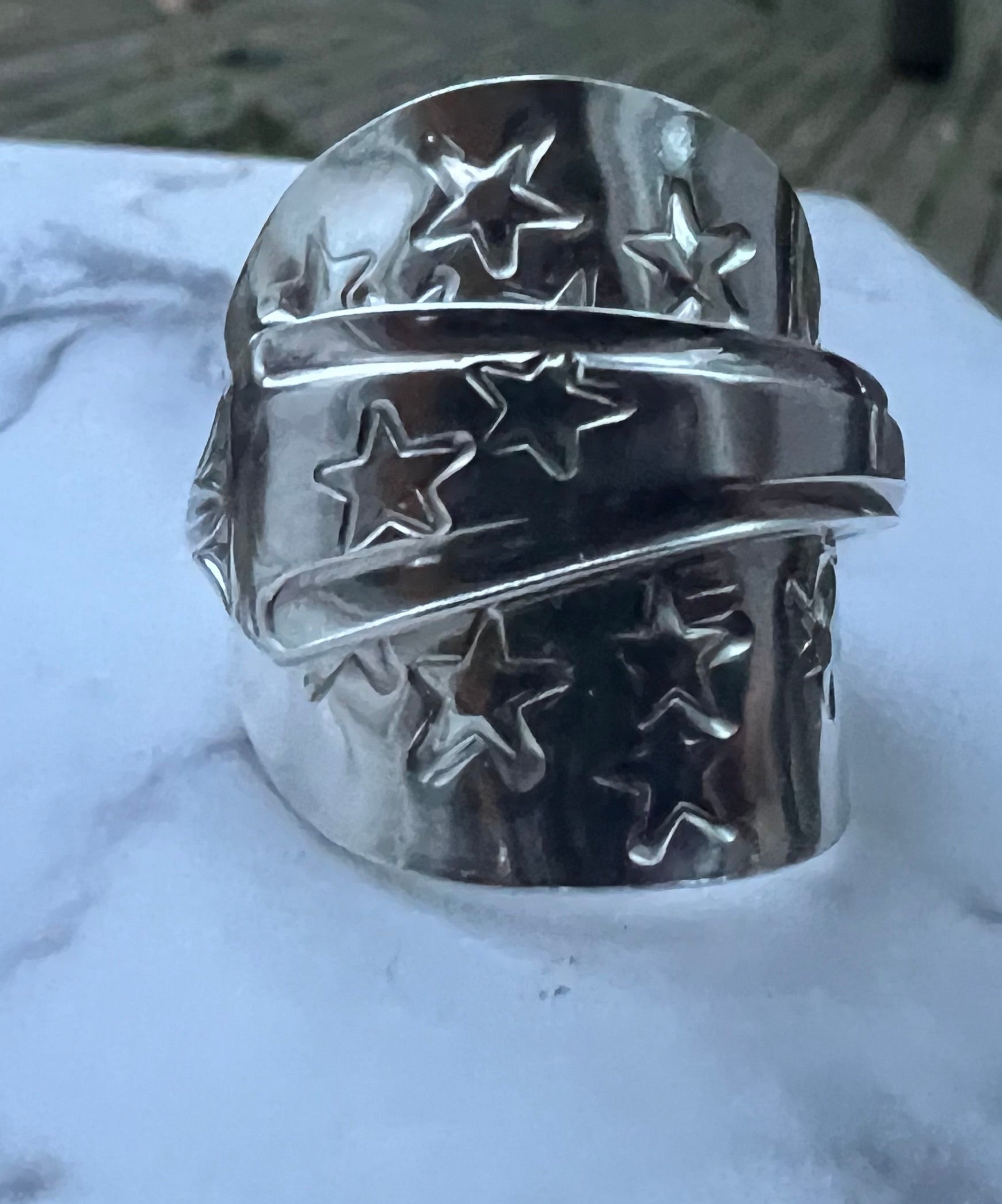 This ring has been made from a Priestley & Moore Sterling Silver spoon in the 1930s. This had been stamped with stars but is available plain.