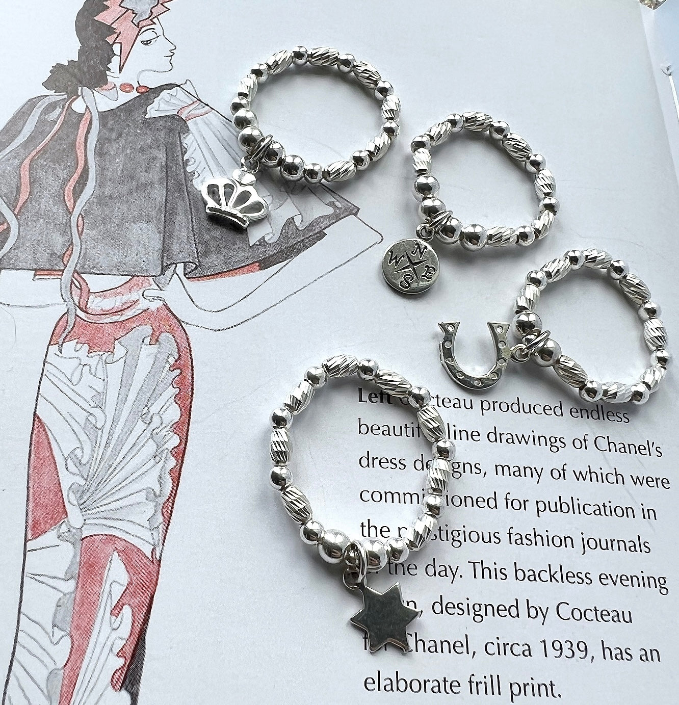 The ring features 3mm, 4mm and sparkling oval beads and sterling silver charm of your choice,